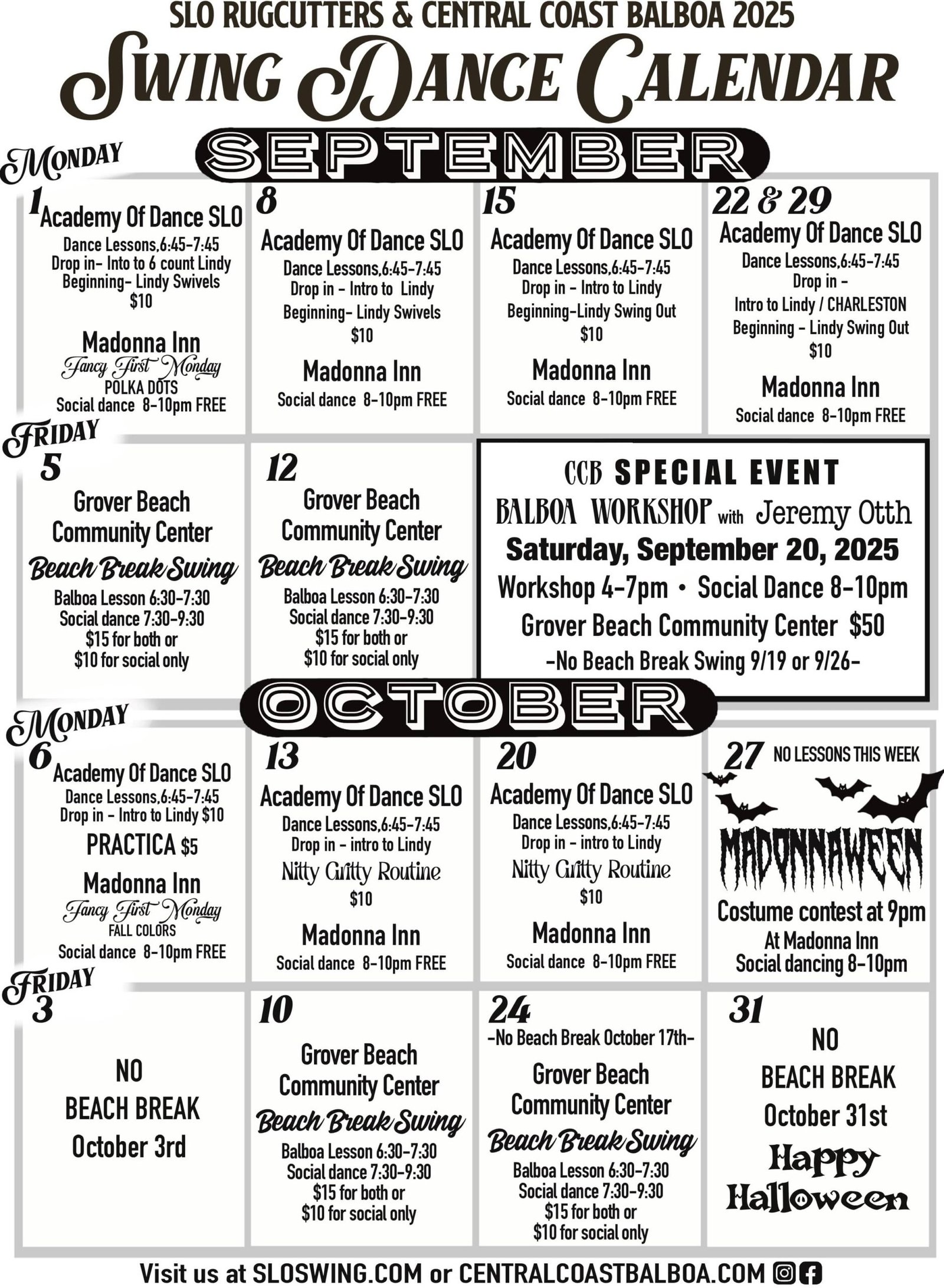 Our weekly dance starts right after the last class ends, so you can get dancing right away. The Madonna Inn hosts our weekly swing dance night from 8-11pm, so please join us!